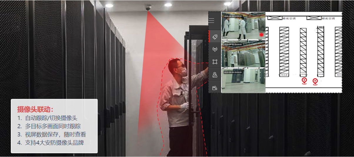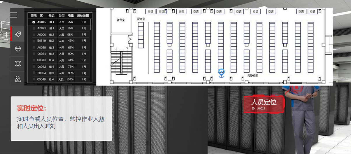 面對行業的需求大背景,全跡提出更具針對性的數據機房定位系統,通過在區域內布設有限數量全跡UbiTraq基站,實時精確地定位人員、資產上的標簽位置,即時將人、物的位置信息顯示在機房控制中心,進行安全區域管控、人員在崗監控、歷史移動軌跡查詢、電子圍欄、SOS一鍵報警等。
