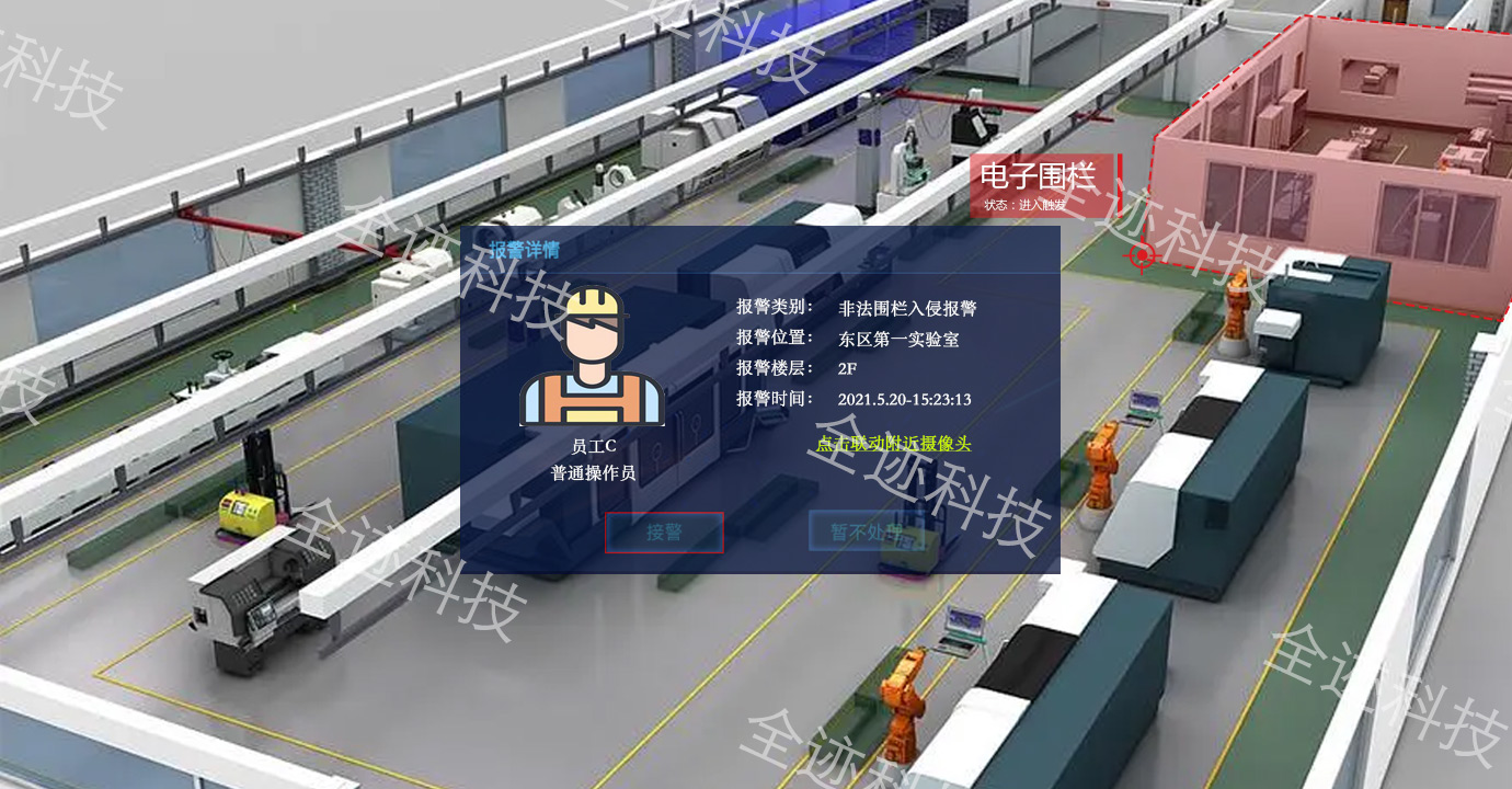 支持多種報警策略如闖入、超員、靠近、越界等;支持彈窗、聲光、震動、蜂鳴報警,支持SOS緊急呼救,一鍵全員撤離。