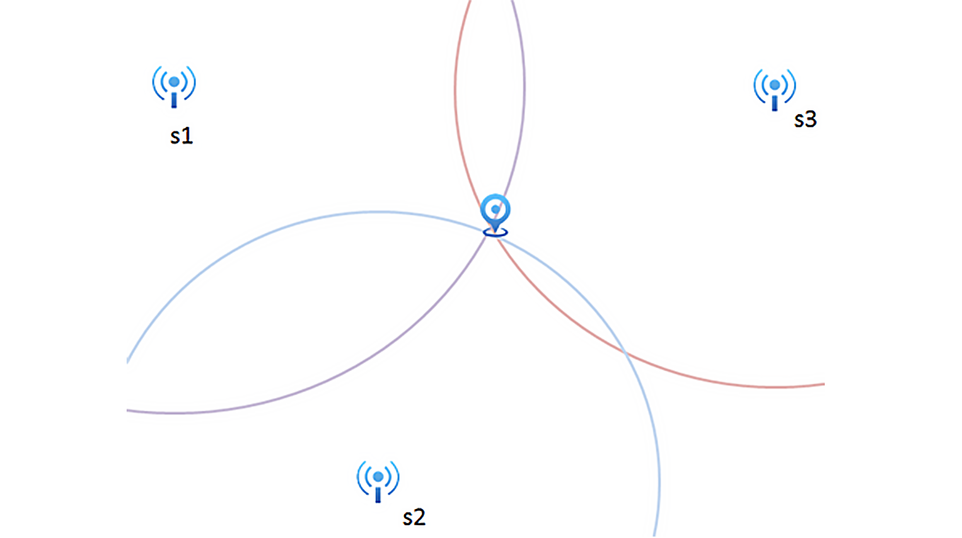 圖1-3是根據到各個基站的測距信息,以基站為中心畫圓,就可以得到一個交點,交點就是標簽的位置。