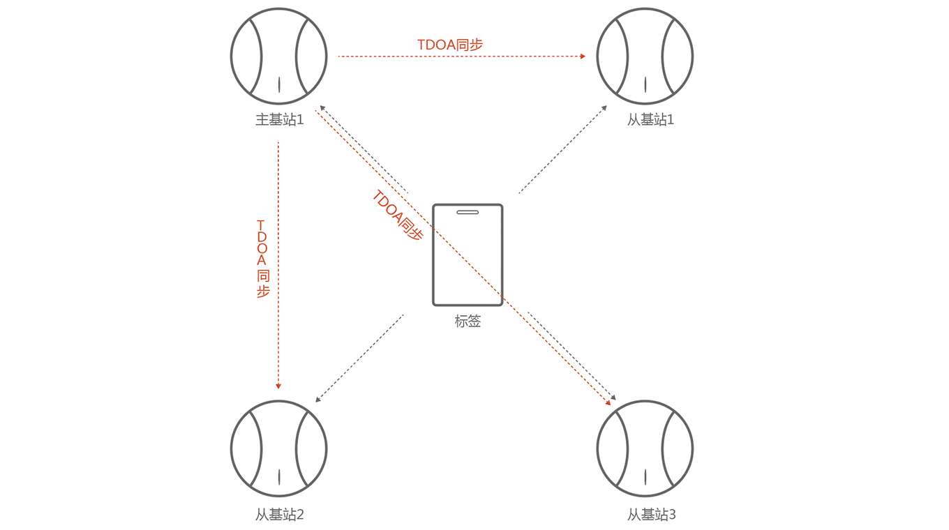 到達時間差(TDoA)技術,以三角形或者四邊形為最小單位,同步方式可以做到主基站同步從基站,而且主基站也可以同步其他主基站,這樣只需要注意基站在現場布局形狀,就可以做到無限基站的擴展;而且增加的基站不會對其他現有的基站造成任何影響。