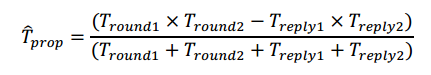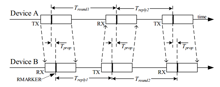 以下圖中最常用的3消息雙向測距方法為例,標簽和基站的測距流程如下圖所看到,標簽可以看做設備A(Device A),基站可以看做設備B(Device B),設備A主動發(fā)起第一次測距消息,設備B響應,得到4個時間戳,設備A等待Treply2之后再發(fā)起,設備B接收,再得到2個時間戳。因此可以得到如下四個時間差:
